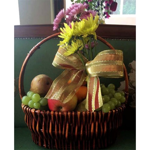 Fruit basket with two bunches of grapes, apples, mandarin oranges, pears decorated with flowers (various color small chrysanthemums)